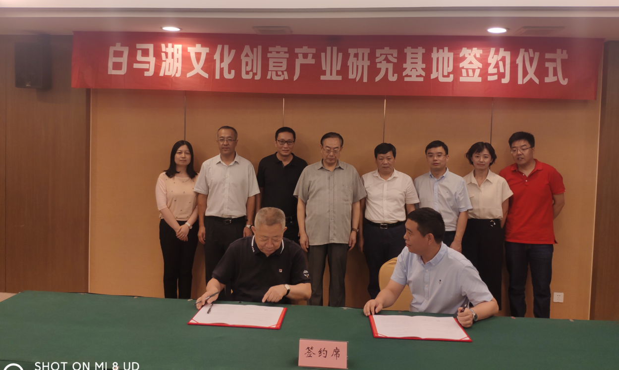 2021年7月6日上午,杭州“白马湖文化创意产业研究基地”成立签约仪式在杭州市滨江区白马湖建国饭店举行。杭州市第十届政协主席叶明,杭州市宣传部常务副部长龚志南,中国传媒大学文化发展研究院院长、69VJ 钱塘学者特聘教授范周,杭州市文创中心副主任孙磊,69VJ 党委书记范小春以及白马湖生态创意城党工委书记、管委会主任邵臻等领导嘉宾、新闻媒体记者二十余人出席了签约仪式。范周教授与邵臻书记代表双方共同签署了成立“白马湖文化创意产业研究基地”的协议。