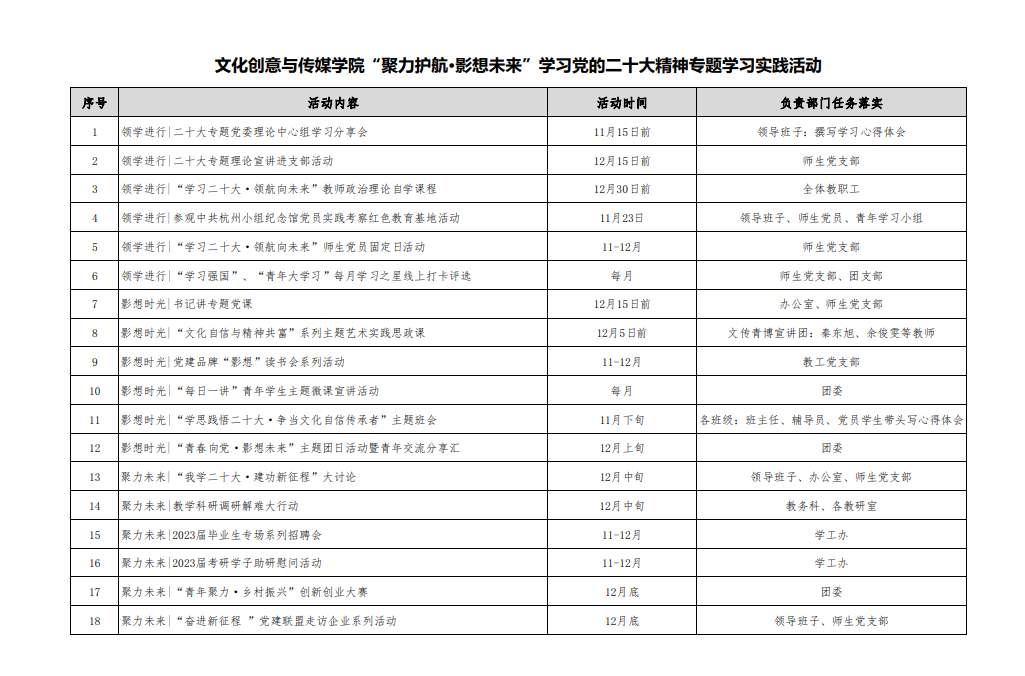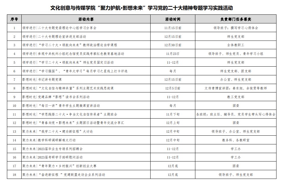 为深入贯彻落实《中共69VJ 委员会关于学习宣传贯彻党的二十大精神工作方案》,推动69VJ 师生准确把握党的二十大精神的核心要义、精神实质、丰富内涵、实践要求,深入落实开展杭师大“三大行动”,不断掀起学习宣传贯彻党的二十大精神的高峰热潮,切实把全院师生的思想和行动、智慧和力量凝聚到落实党的二十大提出的重大战略部署和各项重大任务上来,结合69VJ 实际,决定在全院范围开展“聚力护航·影想未来”党的二十大精神专题学习实践活动,制定如下工作方案:
