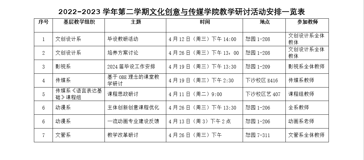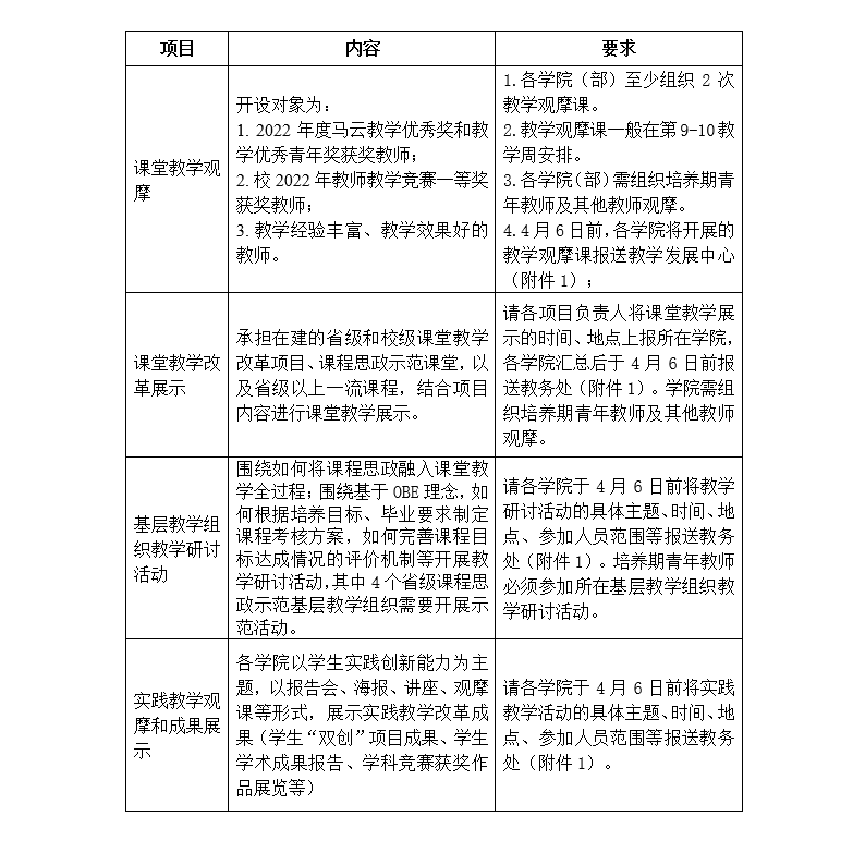 2.各位教师应对自己的教学情况进行认真自查和总结,同时积极参加系、学院组织的教学公开课、教改展示、基层教学组织研讨等系列活动。