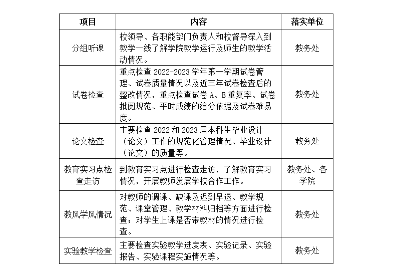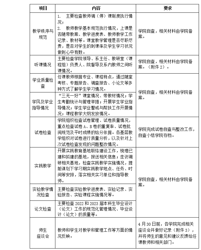 1.学院领导班子和系负责人应深入教学一线,了解教学运行和教学改革情况,有侧重地对教学管理薄弱环节进行专项检查。通过本次活动,营造良好的教学氛围,推广教学经验,建设教学文化。