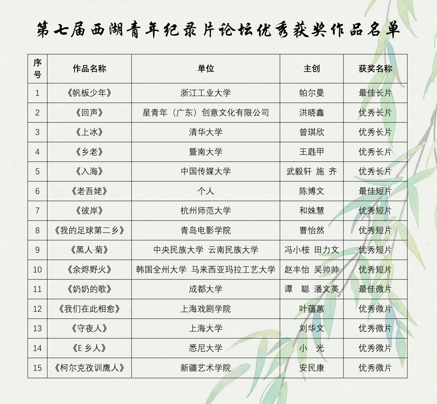 本次论坛评选出15部优秀作品奖,以及最佳长纪录片奖、最佳短纪录片奖和最佳微纪录片奖。获奖名单如下: