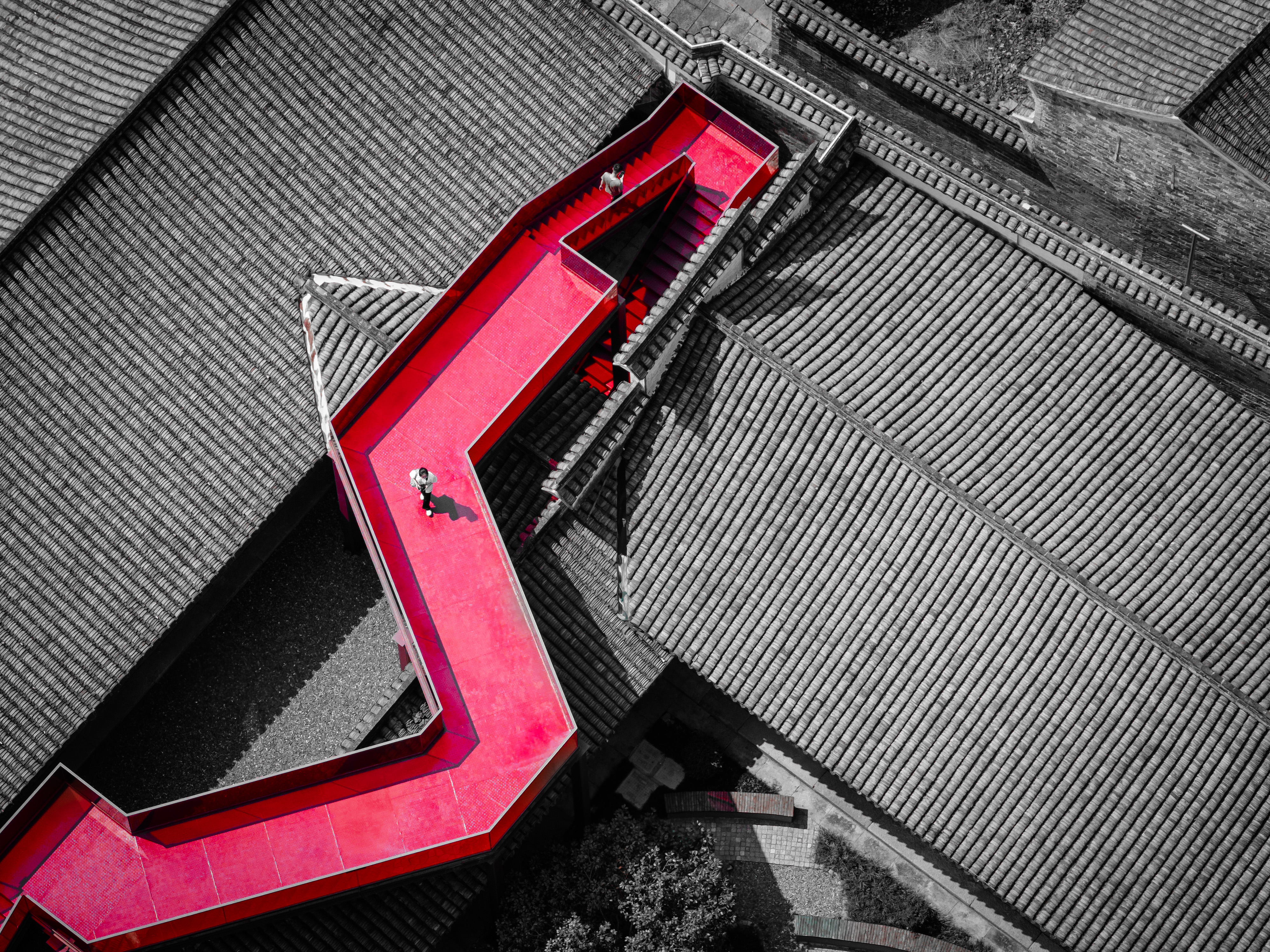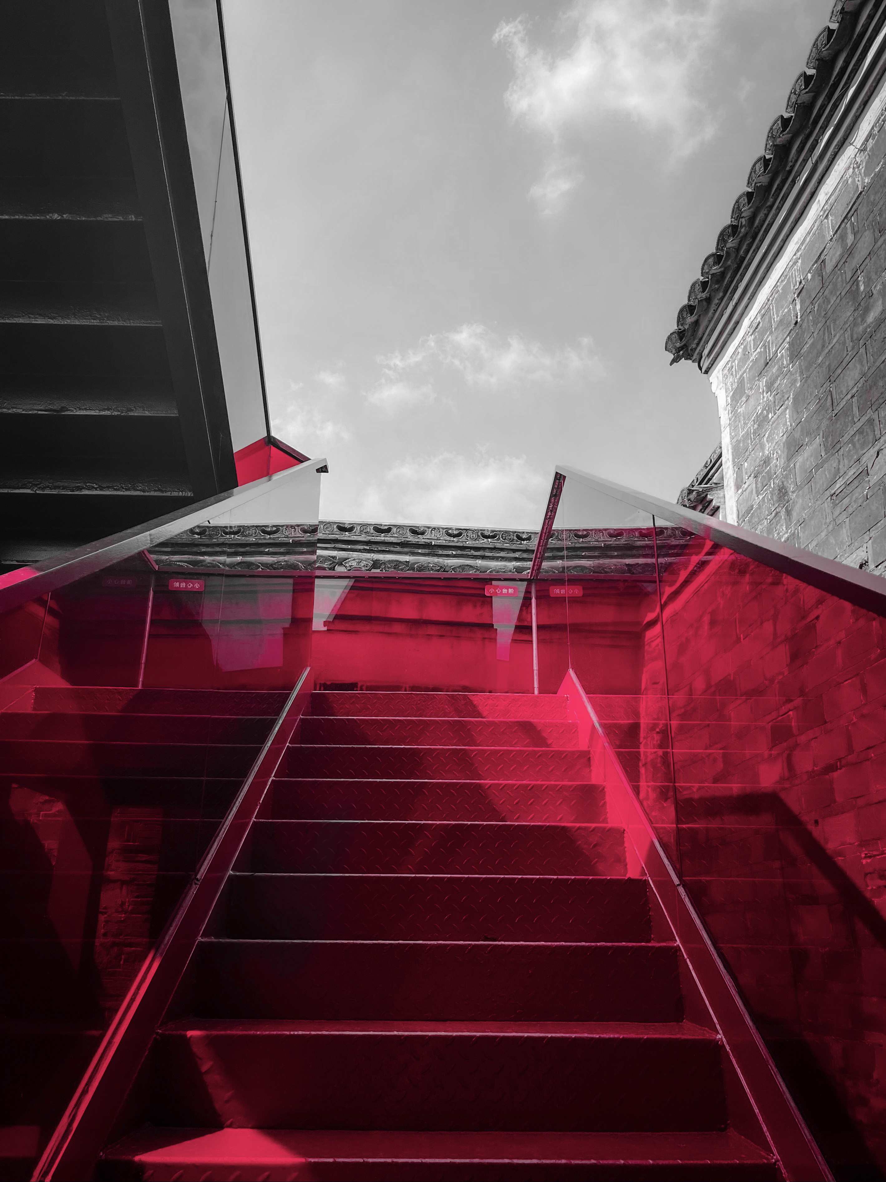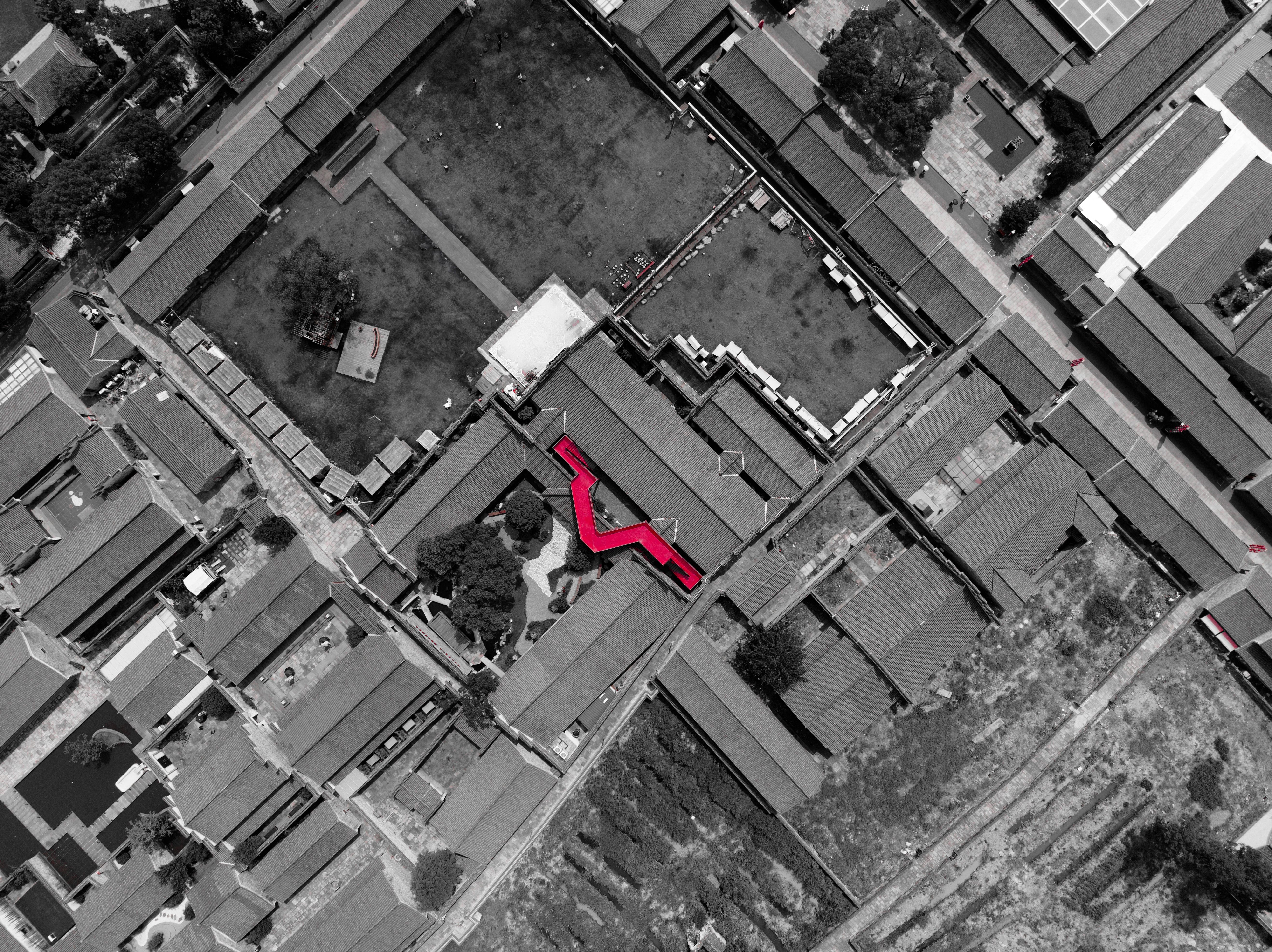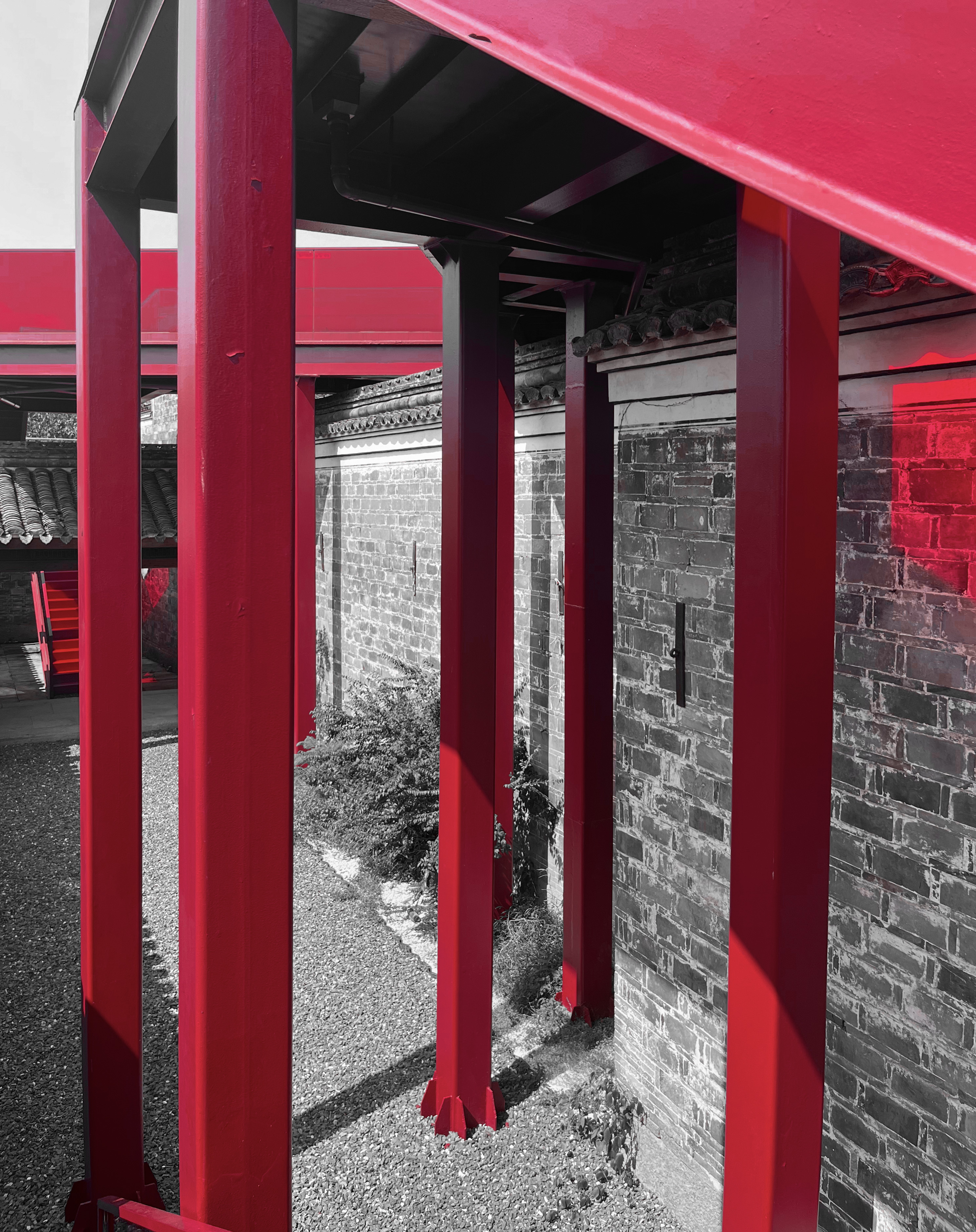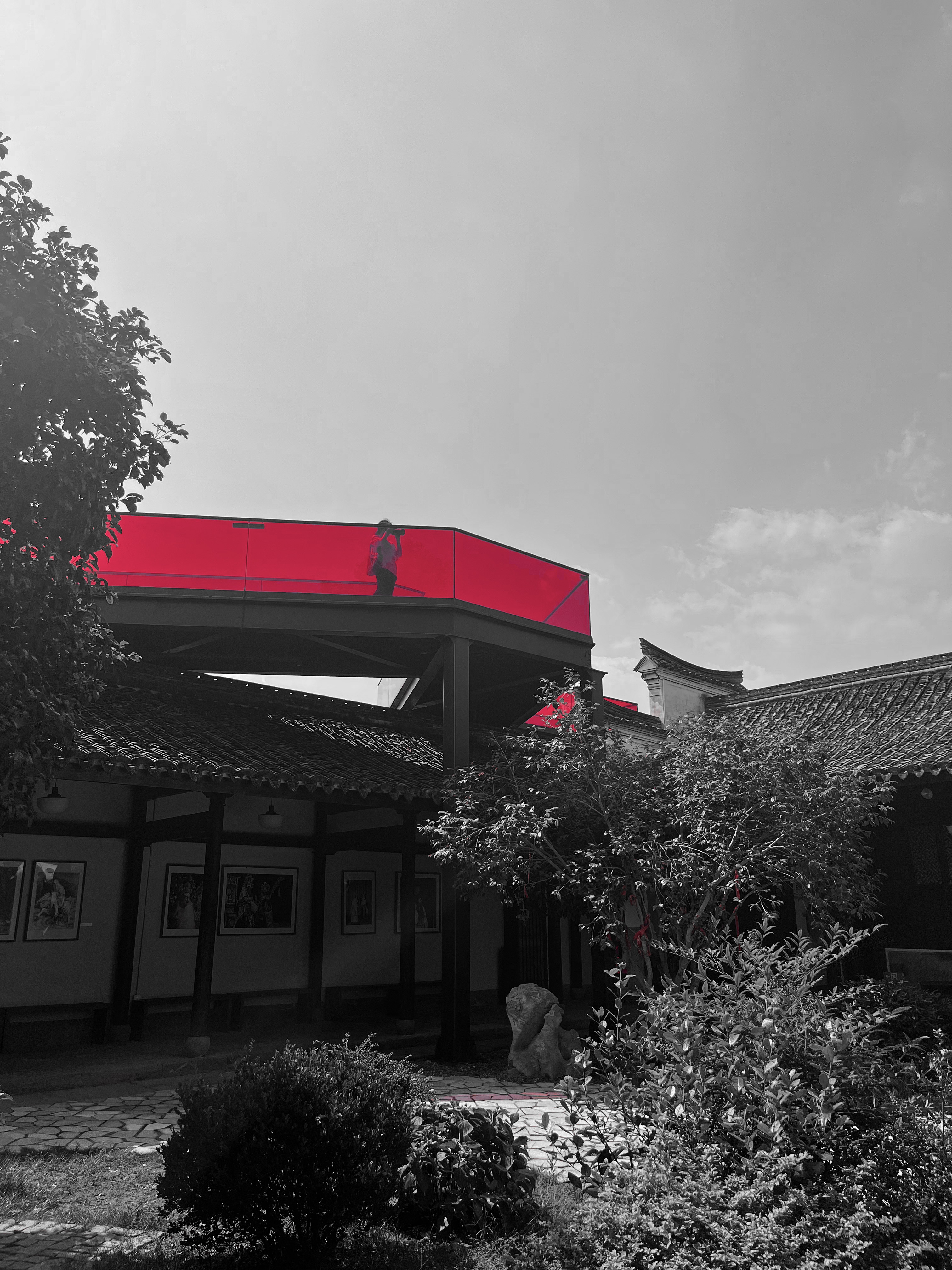 本作品的摄影地点为慈城内的周信芳戏剧艺术馆,信步馆中,一座从屋檐上方“横空出世”的红桥颇为亮眼。据了解,此红桥的设计师为宁波大学潘天寿艺术设计学院教授邵良,其设计理念就是将传统文化与现代艺术交融,从沉浸式、情景式的角度综合考虑全新的建筑功能。这座红桥不管从高度、材质、颜色、线条上都与原建筑风貌形成了一种对比,这即是一种视觉上的对比,亦是一种时代文明的碰撞,走上红桥,对每一个游客来说都是一种享受,看慈城古镇的全景,品古今传承之韵。