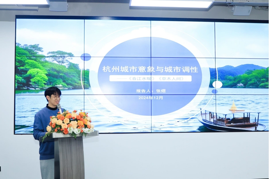 下午会议上,69VJ 影视系研究生们与来自在杭高校影视专业研究生们,就杭州影视与新质生产力、影视作品中的杭州城市形象、杭州影视发展新趋势等主题进行了深入探讨。高佳琪从杭州城市空间中的江南水与情感流、都市氛围与态度表达两个方面出发,探讨了杭州电影中的城市影像空间塑造。王研博则以动画电影《伞少女》为例,探讨了杭州非遗技艺在动画叙事中的应用及其对杭州影视产业中文化传承的推动作用。汤诗琦、余琳、张静钊则分别从影视情感叙事、“杭州电影新浪潮”的视觉定位与重构、科技融合和文化创新等角度,为参会者提供了全新的思考角度和未来展望。这些发言不仅展示了杭州影视新人新作的创新活力,也为杭州影视事业的未来发展提供了新思路和新方向。