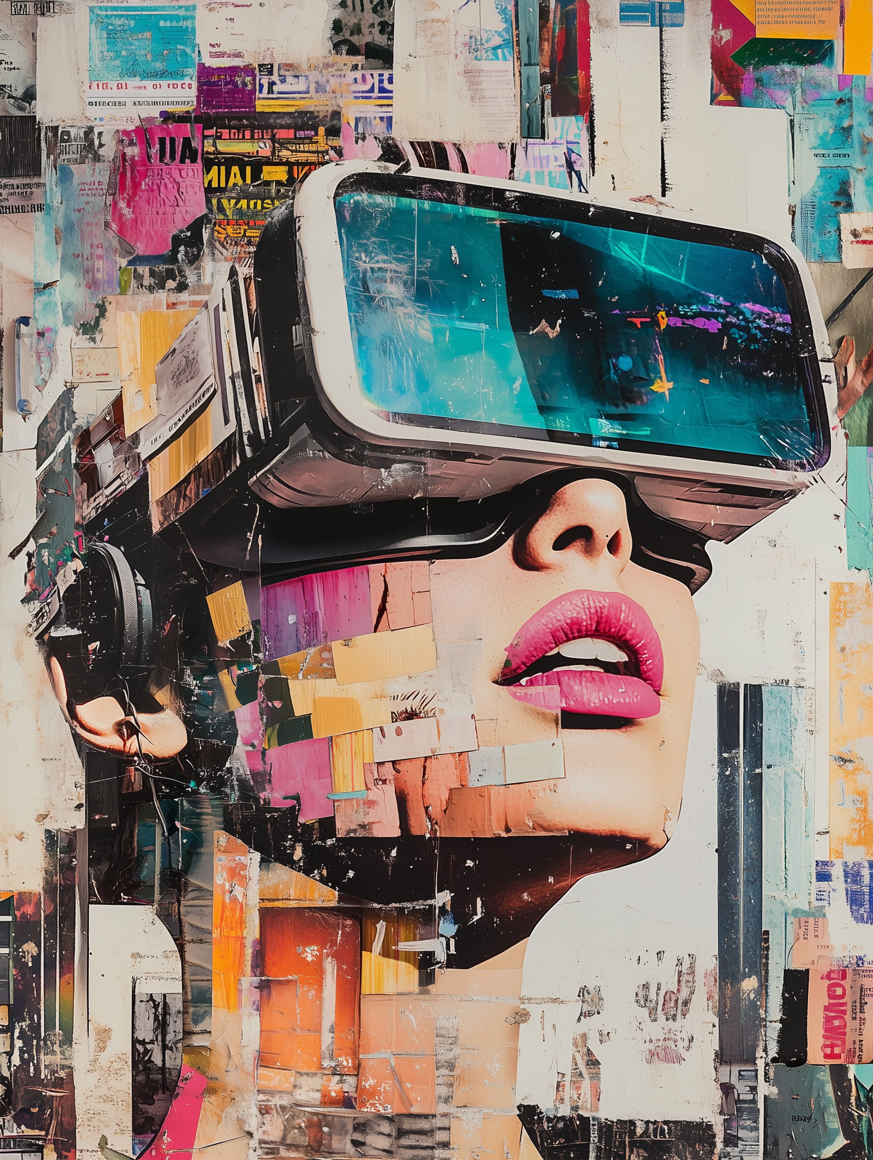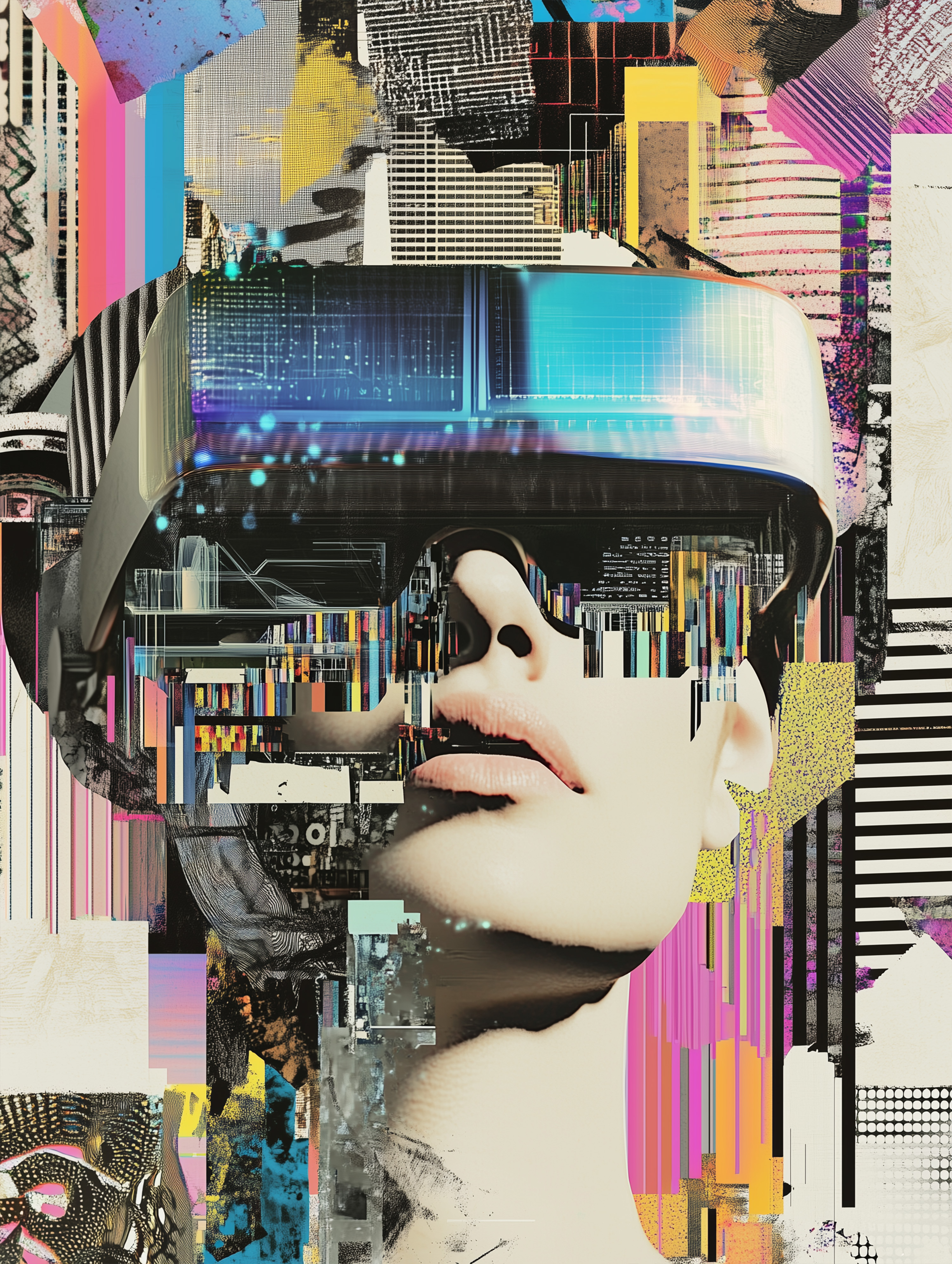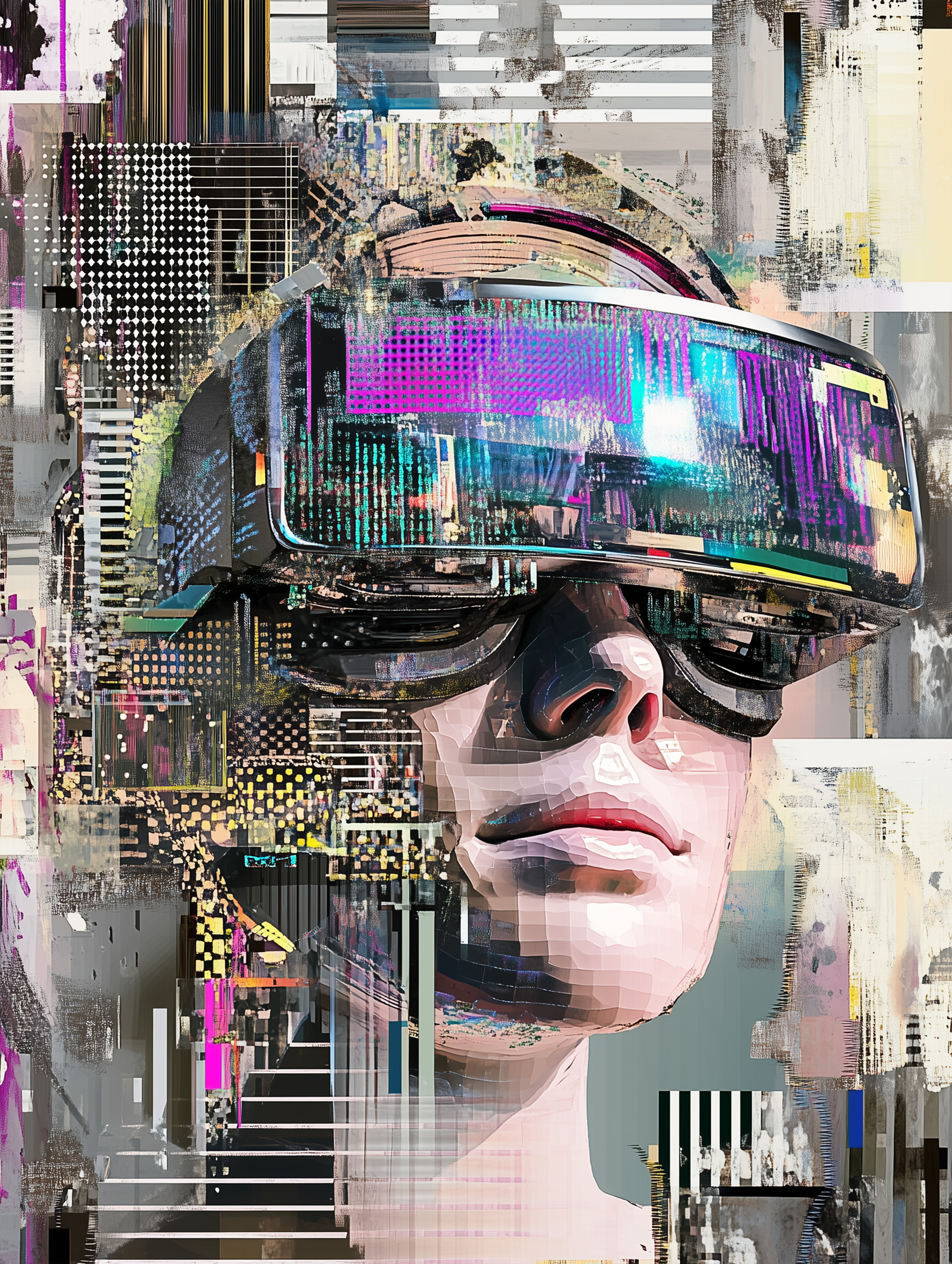 这系列作品以一位佩戴VR眼镜的女性形象为核心元素,巧妙地融合了科技与艺术的界限。女性侧脸轮廓清晰,仿佛正沉浸在一个虚拟与现实交织的世界中。她的眼神专注而深邃,似乎在探索未知的领域。背景由各种抽象图案构成,色彩斑斓且富有层次感。这些图案既像是数字代码,又像是宇宙星辰,给人一种无限延伸的感觉。它们环绕着女性的头部,形成一种光环效果,强调了她在这一场景中的中心地位。整体而言,这幅作品传达了一种对未来科技的憧憬和对未知世界的好奇心。它鼓励观者思考现实与虚拟之间的关系,以及人类在不断进步的技术面前所扮演的角色。同时,作品的视觉效果也十分震撼,令人过目难忘。